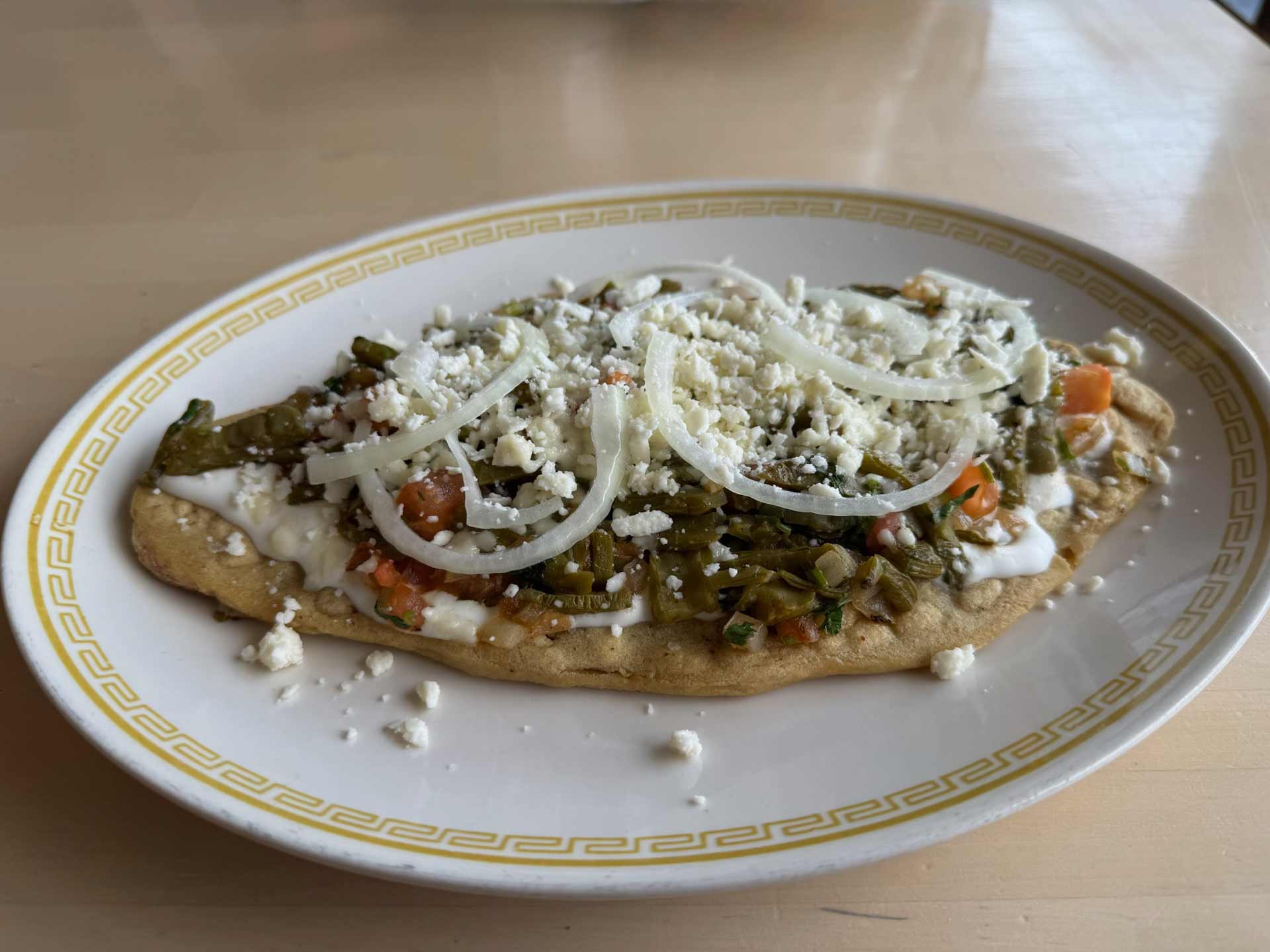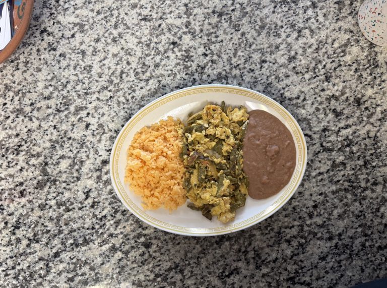 Crispy tortilla chips simmered in zesty green tomatillo salsa, topped with melted cheese, crema, onions, and queso fresco. Served with refried beans and your choice of eggs, chicken, or steak. A bold and comforting Mexican classic.